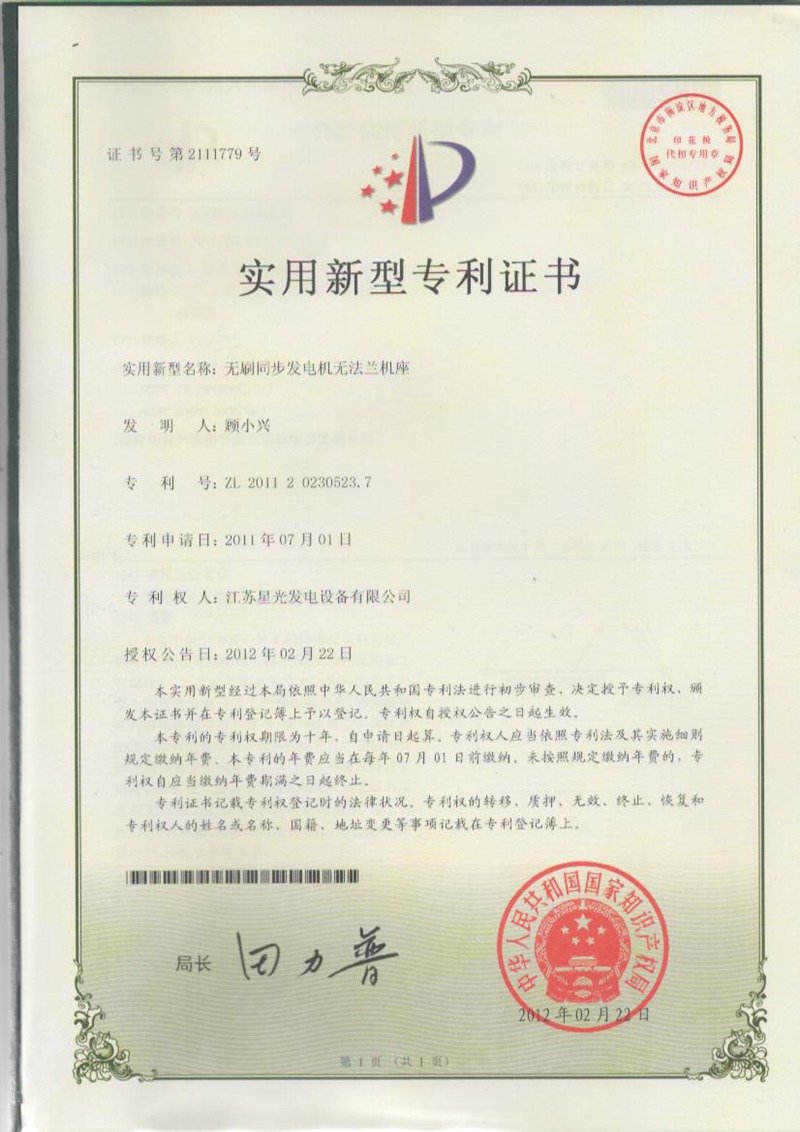 無刷同步發(fā)電機(jī)無法蘭機(jī)座-專利證書