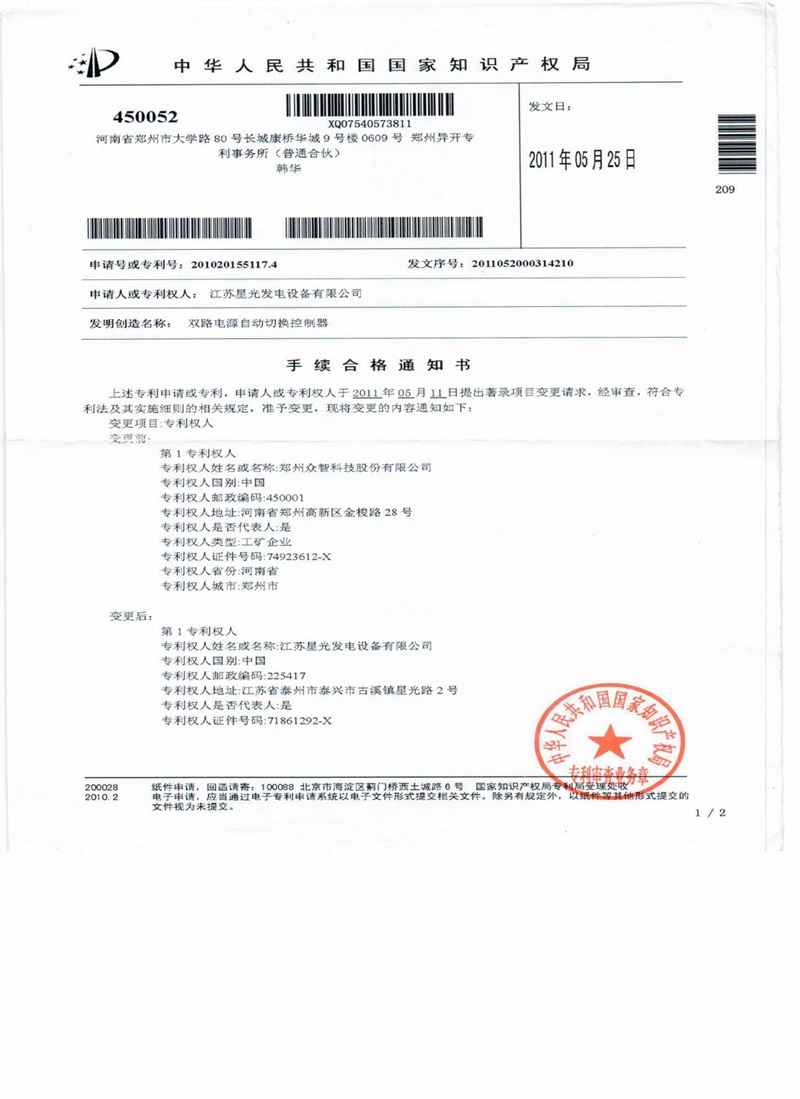 雙路電源自動切換控制器-專利證書